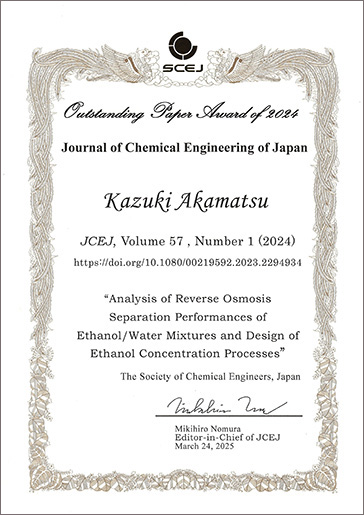 赤松憲樹教授(環境化学科)が Journal of Chemical Engineering of Japan の Outstanding Paper Award を受賞