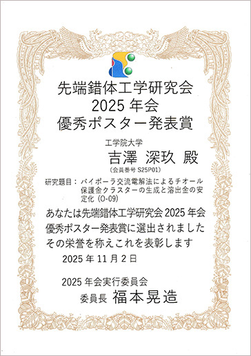 化学応用学専攻 吉澤深玖さんが先端錯体工学研究会にて優秀ポスター発表賞を受賞