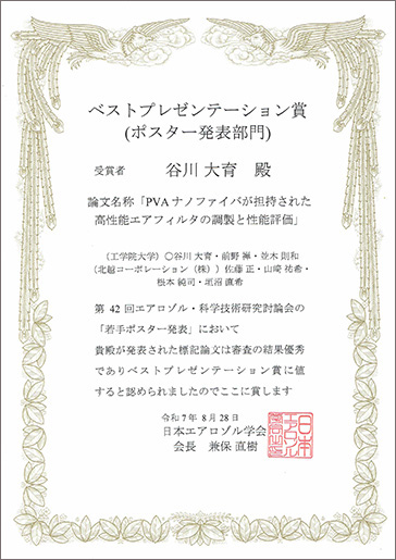 化学応用学専攻 谷川大育さんが第42回エアロゾル科学・技術討論会にてベストポスター賞を受賞