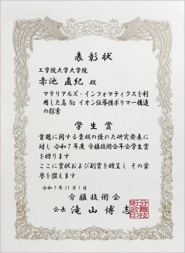 2025年10月31日・11月1日に日本大学駿河台校舎で開催された「分離技術会年会2025」において、化学応用学専攻1年の赤池直紀さん(環境計算化学工学研究室・高羽洋充教授)が学生賞を受賞しました。
