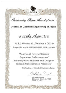 エタノール水溶液の逆浸透分離データを解析する手法の有効性を示し、さらに膜分離を利用した新たな濃縮プロセスと膜に求められる性能を提案した論文で、2024年 12 月に Journal of Chemical Engineering of Japan に掲載されました。本賞は2024年に掲載された論文の中から、特に優秀な論文として選定されたものです。